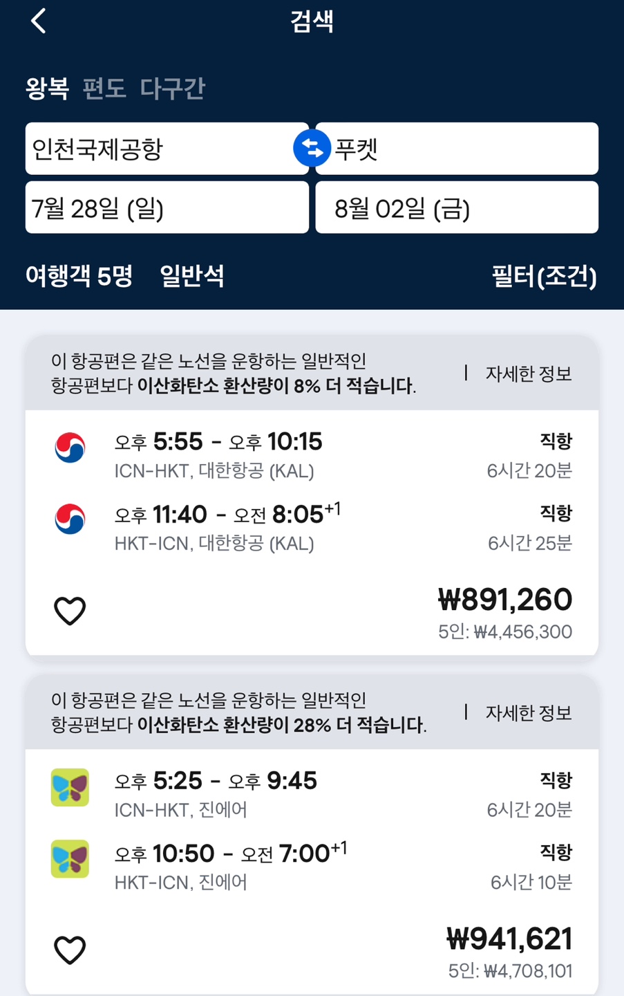 1. 스카이 스캐너 어플에서 왕복 항공으로 1회 경유를 선택하여 인천-목적지(예.푸켓)를 설정한다.